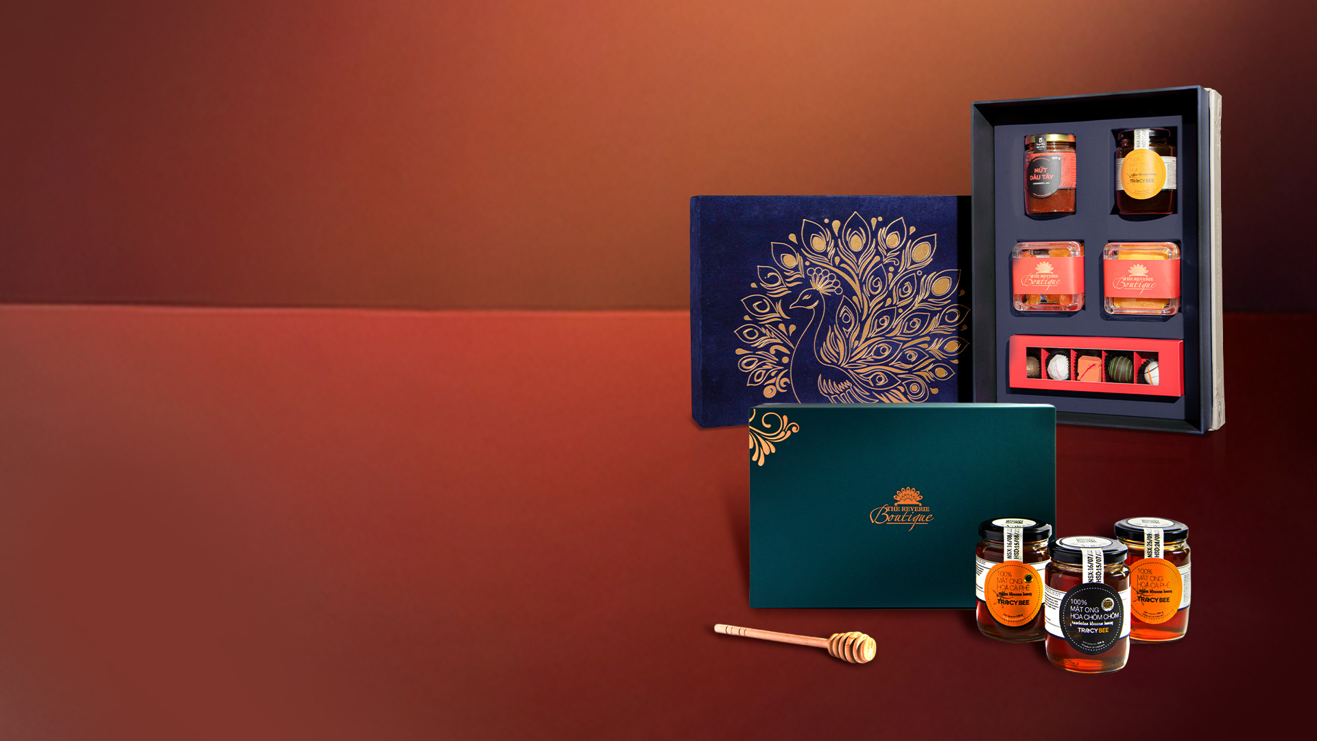 The Reverie Boutique honey set includes wooden honey dipper in a premium case.
